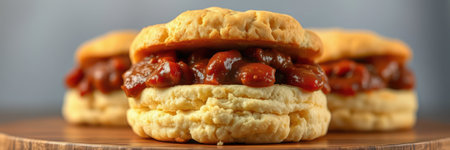 Savory biscuit sandwich filled with rich chili in a cozy kitchen setting