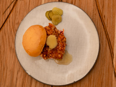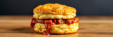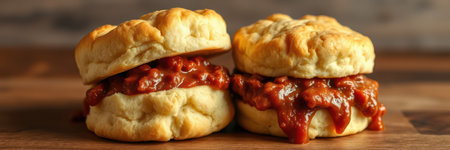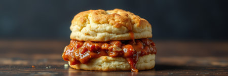 Delicious biscuit sandwich loaded with savory barbecue filling on a wooden surface during a cozy meal time