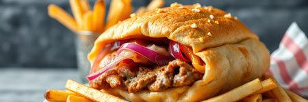 Juicy sandwich with grilled meat and fresh toppings served with crispy fries on a wooden table