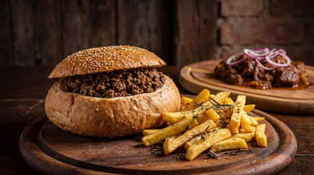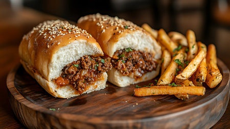 Close up captures two halves of a sesame seed topped sloppy joe sandwich on a wooden surface, with crispy golden brown fries arranged in the foreground.