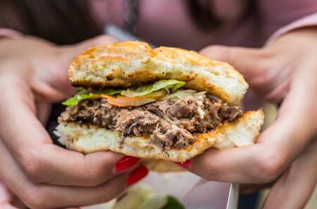 Young woman eating a duck meat burger at a street food market