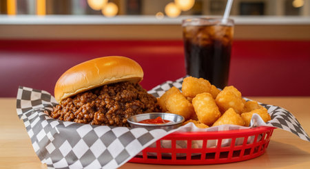 Sloppy joe sandwich with ground beef and tater tots in red basket on diner table, view of classic american fast food meal.