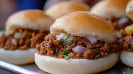 A close-up of delicious kheema pav, spicy minced meat served in a soft bun with onions and lemon, fresh from a street vendor in India.