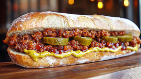 An artistic shot of a pork belly sandwich with crispy skin, layered with pickles and mustard on artisan bread, highlighting the deliciousness of this comfort food