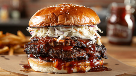 A gourmet hamburger with smoked brisket, coleslaw, and barbecue sauce on a toasted onion bun.