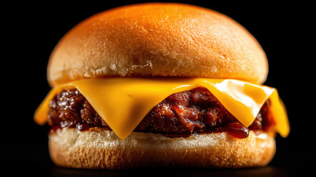 A striking close-up of a cheeseburger featuring a juicy beef patty and melting cheese, ideal for showcasing delicious fast food delights in any culinary project.