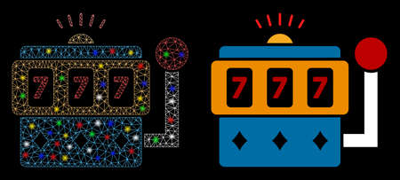 Glossy mesh casino machine icon with lightspot effect. Abstract illuminated model of casino machine. Shiny wire carcass polygonal mesh casino machine icon. Vector abstraction on a black background.