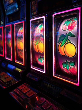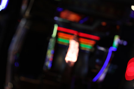 Defocused slot machines glow in casino on fabulous Las Vegas Strip, USA. Blurred gambling jackpot slots in hotel near Fremont street. Illuminated neon fruit machine for risk money playing and betting.