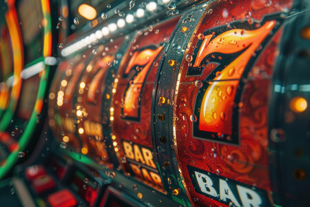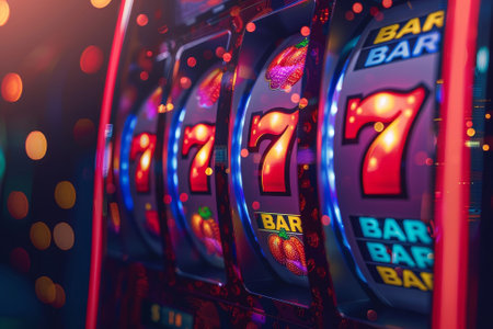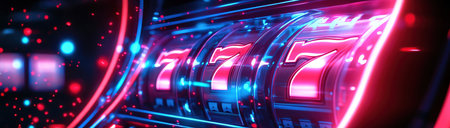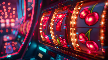 glowing slot machine showing three sevens and cherries, symbolizing a casino jackpot win with neon lights. raster illustration. Wide banner image