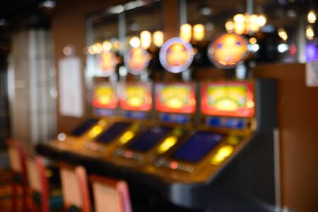 Out of focus blurry image of casino equipment. Blurred slot machines in a casino.