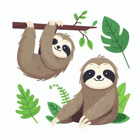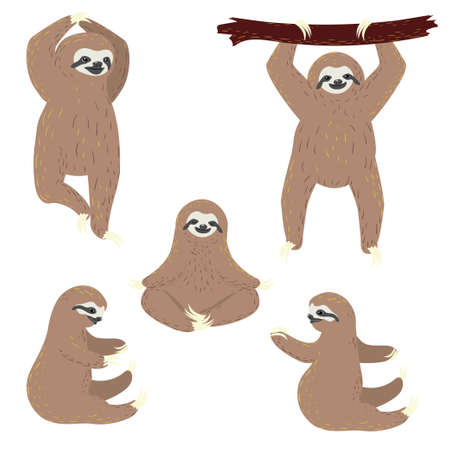 Cute sleepy sloth on branch flat icon set. Cartoon character of little sloth hanging, sleeping, lying or playing with baby isolated vector illustration collection. Animal and zoo concept