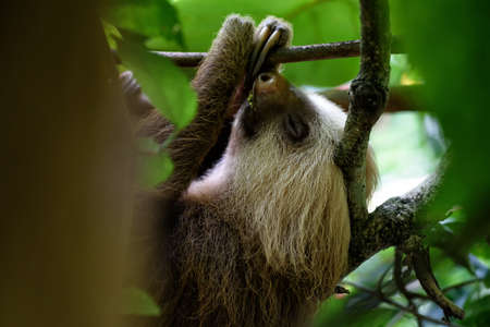 Cute sloth hanging on tree branch. Perfect portrait of wild animal in the Rainforest of Costa Rica.