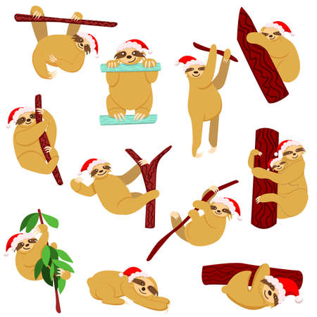 Collection with sloths. Sitting, relaxing, playing, hanging on branch. Cartoon style. Cute and funny. Merry Christmas. Happy New Year. Poster, post card, print, graphic design, textile