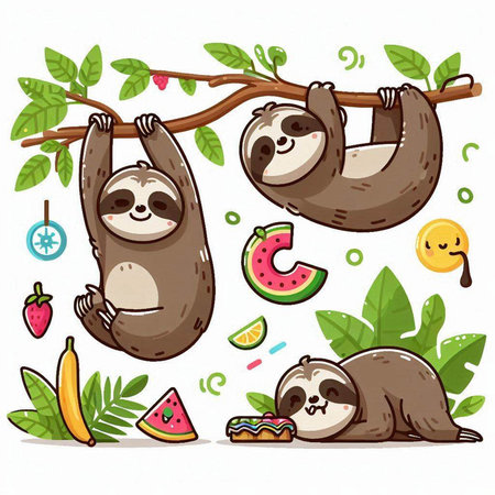 Vector illustration of cute sloth hanging on a tree branch with fruits and sweets