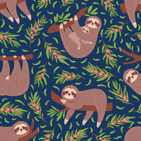 Cute sloths on branch seamless pattern for nursery wallpaper. Baby sloth animal with mother. Funny lazy animals textile print vector texture. Lovely characters in various positions