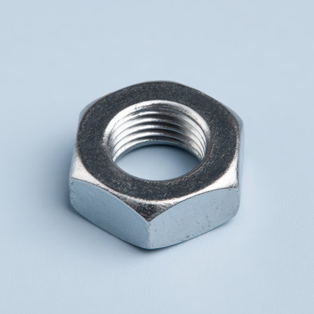 This image features a metallic hex nut isolated on a soft blue background. Ideal for illustrating industrial themes, mechanical components, and tools.
