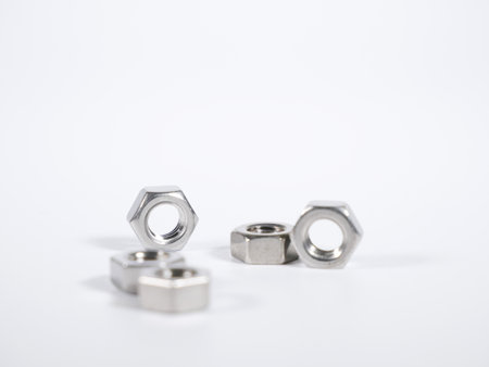 Macro shot metal nut isolated on white background. Chromed screw nut isolated. Steel nut isolated. Nuts and bolts. Tools for work.