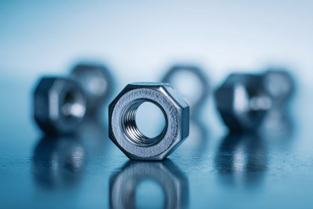 Shiny metallic fasteners rest on a mirror-like surface, with the central nut sharply in focus while the surrounding blur emphasizes craftsmanship and precision.