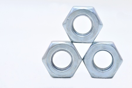 Three galvanized steel nuts on a white background