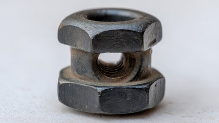 This image showcases a rusty metal hex nut, perfect for illustrating concepts in engineering, construction, or mechanical design. The detailed close-up highlights the texture and wear on the nut's surface, making it ideal for industrial applications.