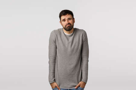 Modest, unconfident young man feeling loser, frustrated and sad standing in grey sweater over white background, shrugging holding hands in pockets, smirk and frowning distressed, indecisive