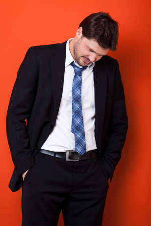 Portrait of adult bearded man with emotion of saddness on face looking at camera