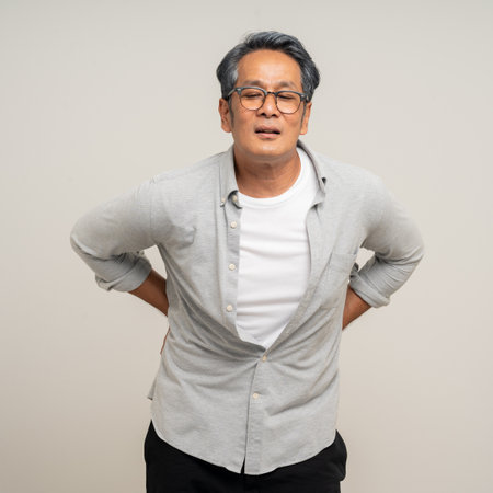 A young Asian man wearing a pink shirt with tropical patterns is in pain in the back. Isolated white background.