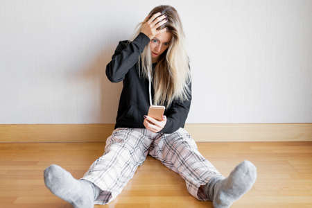 Young girl lost hope and holding her head, tired and upset unhappy freelancer after failure at work concept photo