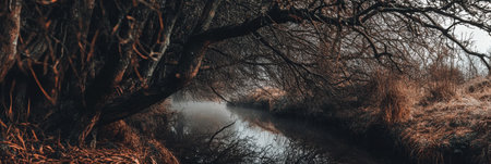 Serene Autumn Creek Nature Scene Tranquil Misty Riverbank Landscape Photography fog dark gold view