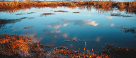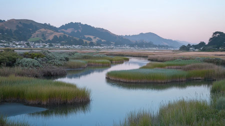 A tranquil marshland scene captured at dusk, highlighting gentle waters, lush grasses, and rolling hills. Perfect for nature enthusiasts and landscape lovers alike.