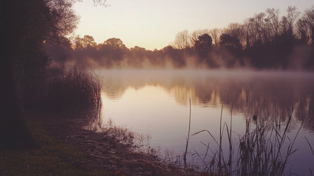 A tranquil lake scene captured at dawn, with soft mist rising from the water and silhouetted trees lining the shore, evoking calmness and serenity.