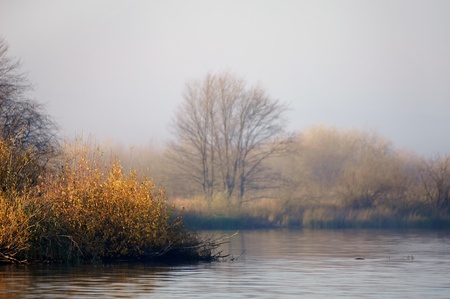 Autumn lake with fog and yellow grass. Movie atmosphere. High quality photo