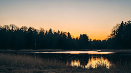Tranquil sunset over a quiet lake with a reflection, leaving space for copy.