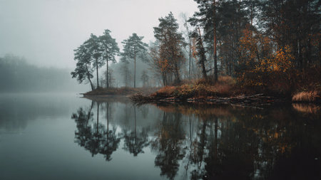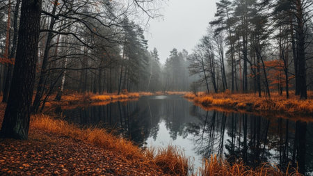 A tranquil image portrays a forest landscape during the autumn season. The composition features a serene body of water reflecting the surrounding trees and overcast sky. The color palette primarily showcases muted tones with highlights of orange foliage. It presents a calm and atmospheric scene suitable for editorial and commercial applications.