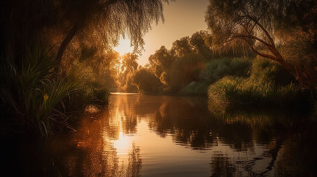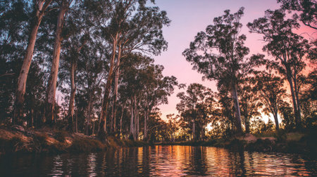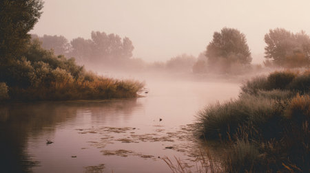 A tranquil river scene at sunrise, showcasing misty reflections and silhouetted trees. This peaceful setting captures the beauty of nature and serenity.