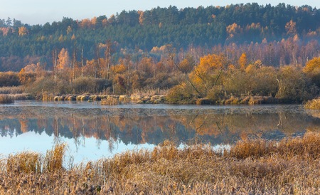 Morning lake at autumn. Beautiful landscape of wild misty lake at sunrise. Polish landscape
