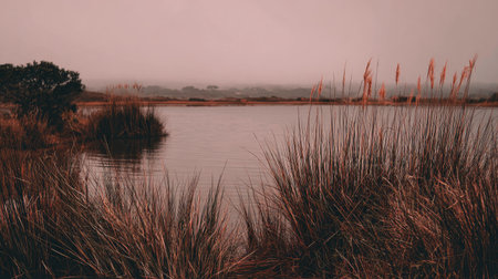 A serene wetland scene captured at dusk, where tall grasses meet calm waters reflecting soft pink hues. This tranquil image embodies the peacefulness of nature.