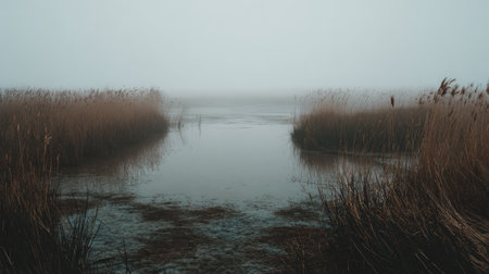 A tranquil view of a foggy marsh showcasing reeds surrounding still water, embodying a serene atmosphere perfect for nature lovers and tranquil scenes.