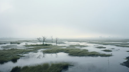 the fog blankets the marsh of west virginia, creating an ephemeral installation reminiscent of australian tonalism and the art of the ivory coast. this photograph captures the essence of new american documentary photography, with its atmospheric color washes and depiction of decaying landscapes. the uhd image showcases the intricate details of this captivating scene. ai generated