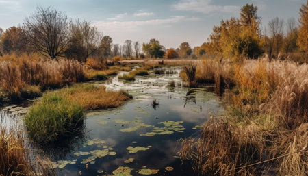Tranquil autumn landscape reflects vibrant multi colored beauty in nature generated by artificial intelligence