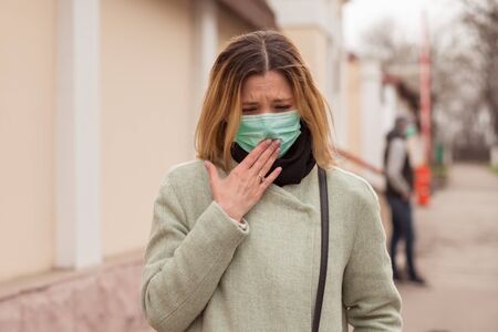 Young girl sneezes and coughs in a medical mask on a bus station. She feels fewer and headache because of a coronavirus symptoms. Stay home during quarantine and do not use public transport
