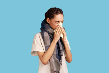 Unhealthy woman feels unwell, blows nose in tissue, suffers from running nose, cold symptoms or allergy, sneezes very often, wearing white shirt. Indoor studio shot isolated on blue background.