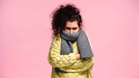 frozen woman in warm scarf and knitted sweater standing with crossed arms isolated on pink