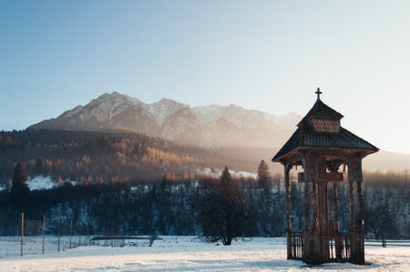 A serene winter scene showcasing a traditional Romanian wooden pavilion with a cross, set against the snow-capped Piatra Craiului mountains. The golden morning light enhances the cultural and spiritual essence of this tranquil rural landscape, reflecting the harmony between tradition and nature in the Carpathian region.