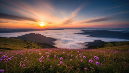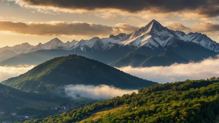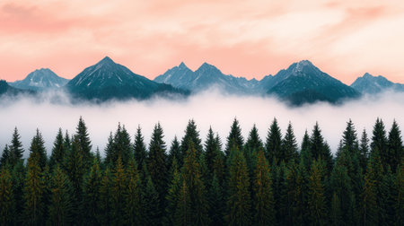 Serene mountain landscape at dawn, shrouded in mist with a vibrant sky.