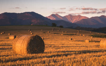 Harvested Field with Hay Bales in Golden Evening Light Under West Tatras Mountains, Slovakia