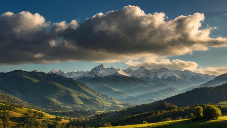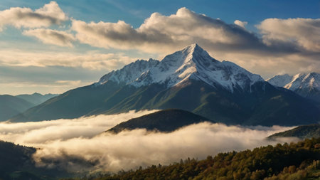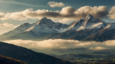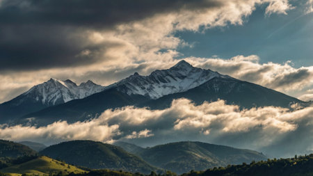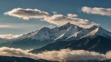 Mountain landscape with snow-capped peaks in the clouds.