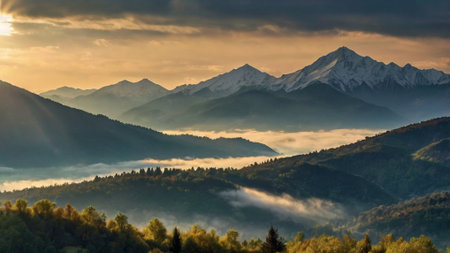 Beautiful mountain landscape with fog and sunbeams in the morning