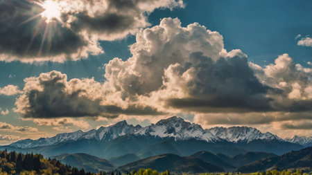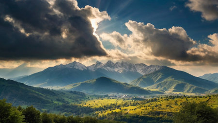 Beautiful mountain landscape with clouds and sun in the sky. Caucasus, Georgia.