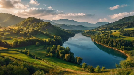 Panoramic view of a mountain river with green trees and grass